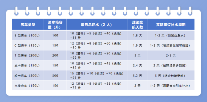 结合上述场景消耗,我们以 “2 人同行、每日 1 顿简餐、1 次节水淋浴” 为标准,计算 6 类主流房车的清水箱续航天数,帮你直观判断 “多久补一次水”:
